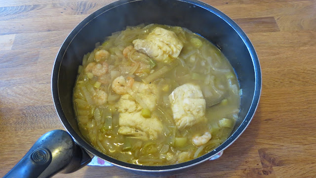 Add the stock to the pan, then place the fish and prawns as much beneath the surface as possible.